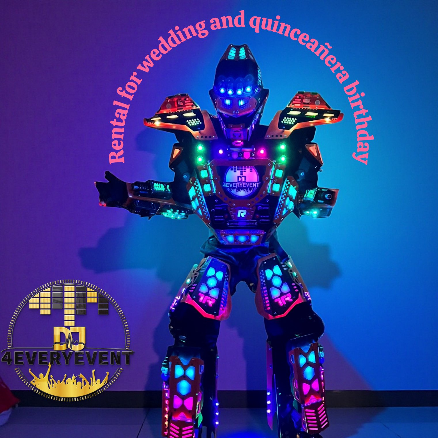 We hired DJ4EVERYEVENT for my daughter’s quinceañera, and they exceeded all our expectations. The 10-foot robot and shots cart were a total hit!